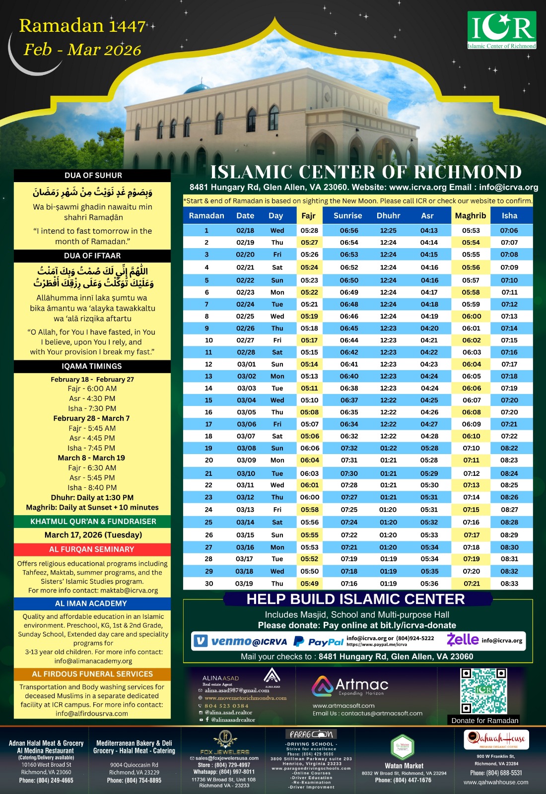 Thank you for considering a donation to the Islamic Center of Richmond (ICR). Your generous contributions play a vital role in supporting our mission of serving the Muslim community and providing essential religious, educational, and charitable services.
